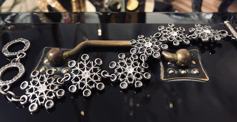 Незвичайний браслет оригінального дизайну, прикрашений стразами. Кольору срібла з міддю. Довжина виробу 19 - 20см.