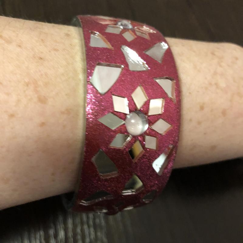 Блискучий браслет малинового кольору. Візерунок викладений скляними елементами і намистинами