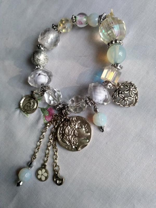 Браслет на резинці, з підвісками, бусини пластик і скло. Нарядний.