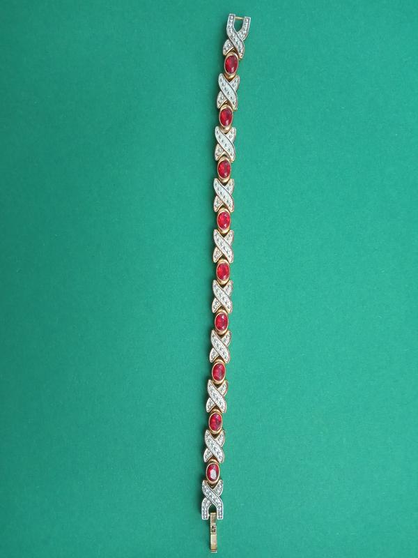 Удивительно красивый винтажный браслет с красными камнями. Выполнен из металла в золотом тоне. Досить важкий. Длина 19,5 см. Бижутерия. Распознавательных знаков, к сожалению, нет. Отличное состояние.