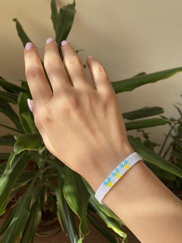 Сірий буде чудово виглядати під будь-річний наряд. Сердечка в кольорах українського прапора служать ненав'язливій родзинкою. Браслет виконаний з високоякісного каліброваного бісеру Miyuki delica. Фурнітура за Вашим бажанням (золото/срібло)