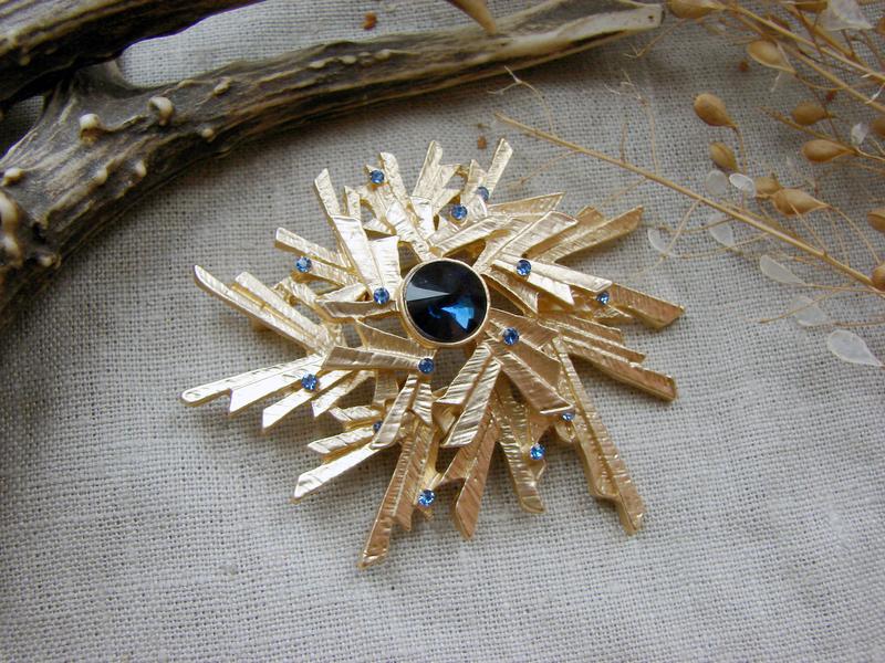 Абстрактна золотиста брошка велика брошка у вінтажному стилі з синім камінням
