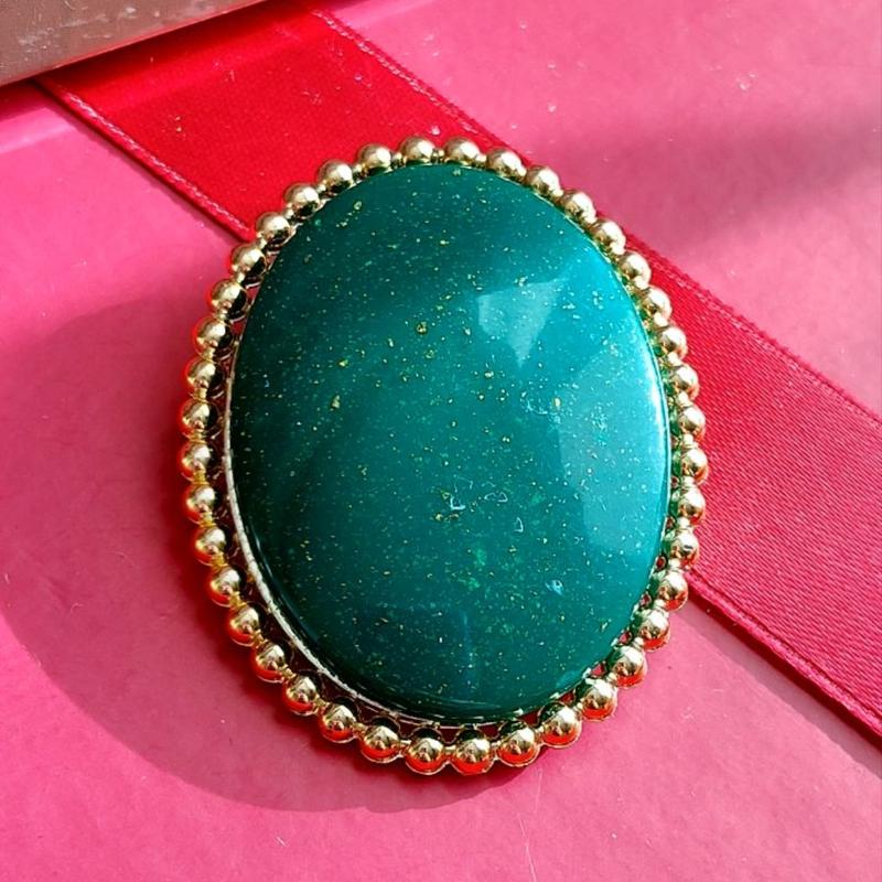 Велика акцентна овальна брошка з пластику та металевого сплаву золотого кольору. Брошка об'ємна і при цьому витончена, з м'яким вишуканим блиском, зроблена дуже якісно, виглядає чудово. Добрий вінтажний стан.Замок робочий. Розмір : 5 × 4 см.