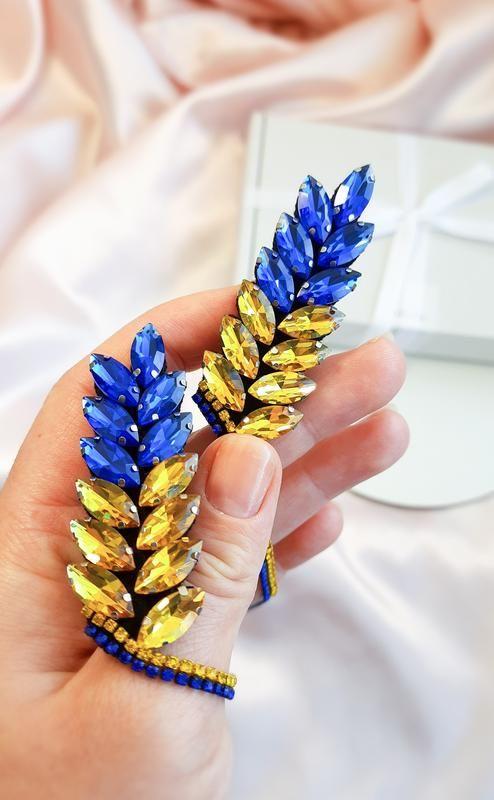 Брош "Колосся", повністю ручна робота, розмір 6.5 см + 12.5 см стразовий ланцюжок (розміри за бажанням можна змінювати), колір жовто-блакитний та золото. Додаткові характеристики: Стать: Жіночий Тематика: Рослини Матеріал: Стрази