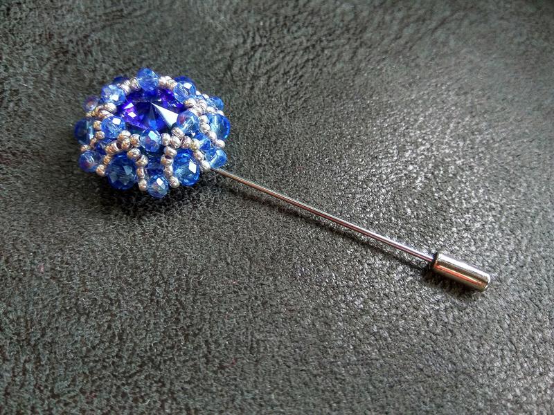 Дуже гарна блискуча брошка з риволі від Сваровські, чеських намистин та чеського бісеру. У діаметрі 28 мм, довжина з шпажкою 8 див. Є в кольрі золота і в кольорі срібла. P. S. Зроблено з любов'ю.