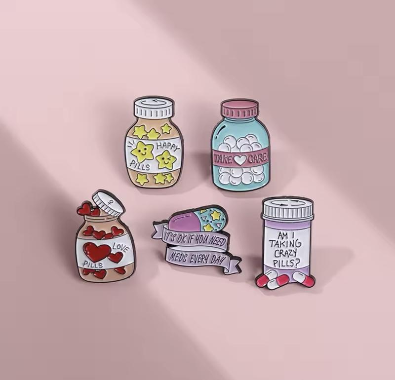 Набір значків / пінів металевих милі та яскраві таблетки в баночках (5 шт)