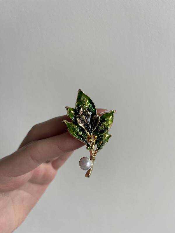 Елегантна брошка у вигляді листочків, виконаних у глибоких відтінках зеленого з золотим контуром і ніжною перлиною внизу. Стриманий, але розкішний дизайн додає шарму будь-якому образу — як діловому, так і святковому. Ця брошка стане чудовим подарунком для поціновувачів стильних аксесуарів та природних мотивів. У наявності лише 1 шт! За бажанням, за додаткову плату можна додати подарункову упаковку у коробочку (від 10 грн до 30 грн — вартість залежить від розміру коробочки).