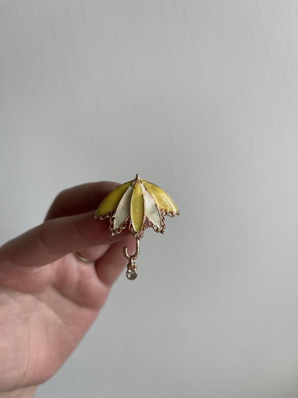 Ця витончена брошка у вигляді мініатюрної парасольки з ніжно-жовтими та кремовими пелюстками – справжнє втілення весняного настрою! Родзинкою дизайну є підвіска у вигляді перлинки, що чарівно поблискує при русі. Ідеально доповнить образ, додасть легкості та оригінальності. Ця брошка стане чудовим подарунком для колекціонерів, романтичних натур або тих, хто любить нестандартні прикраси. У наявності лише 1 шт — ексклюзивна можливість! За додаткову плату можливе подарункове упакування в коробочку (від 10 грн до 30 грн — залежно від розміру коробочки).