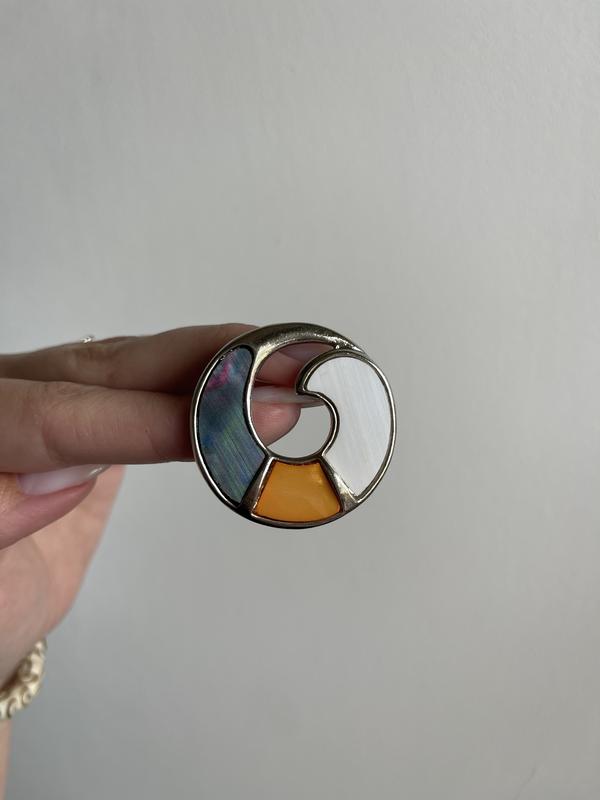 Стильна брошка у формі кільця з кольоровими вставками — ідеальне поєднання мінімалізму й глибини. Гармонійна палітра з перламутрового, білого та жовтого відтінків додає образу спокою та енергії водночас. Ця брошка стане чудовим подарунком для тих, хто цінує нестандартні аксесуари з глибоким змістом. У наявності лише 1 шт. За бажанням можливе подарункове пакування в коробочку (вартість від 10 до 30 грн — залежно від розміру).