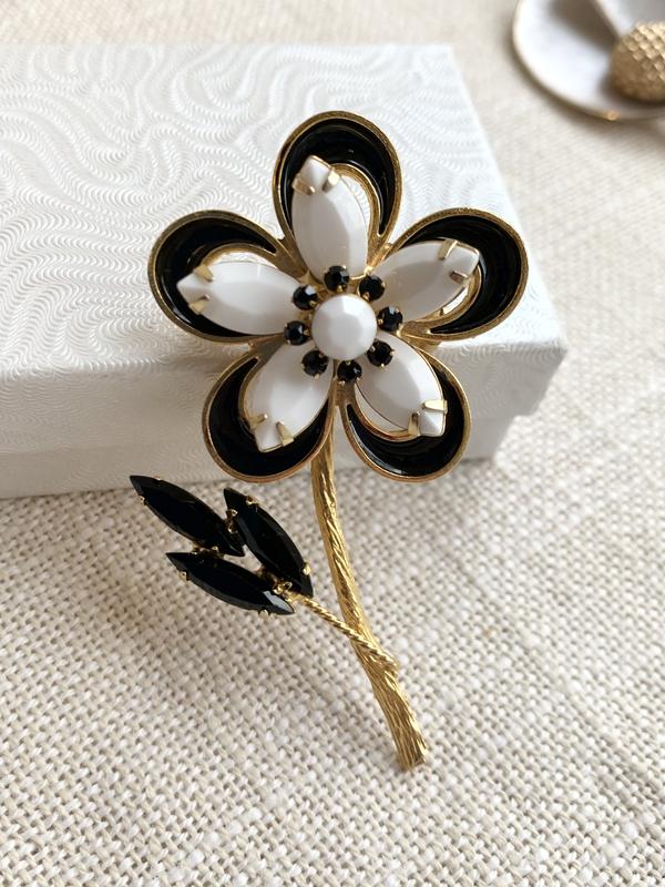 💛Чарівна вінтажна брошка у формі вишуканої квітки. Вона вражає своєю контрастною кольоровою гамою. П’ять пелюсток виконані з білого молочного скла, обрамленого чорною емаллю та тоненьким золотистим контуром. В центрі білий кристал, оточеий дрібними чорними кристалами, що додають витонченого блиску. Стебло та листочки виконані у золотистому металі з фактурною поверхнею, а чорні подовжені камінці на листях створюють гармонійне завершення композиції. Стан відмінний. Маркування немає. Америка, вінтаж. Розмір 7 см.