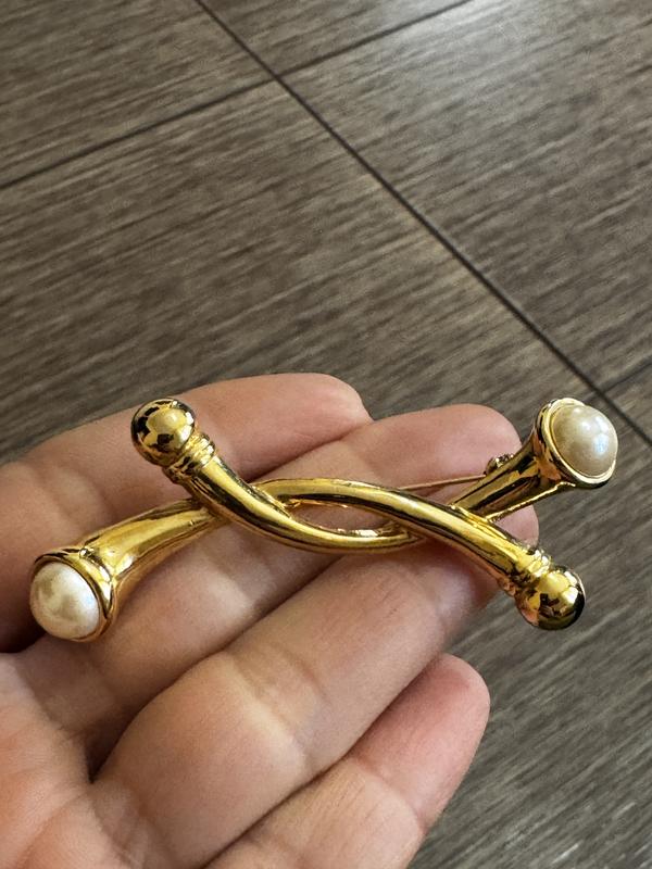 Брошка золотистого кольору з перлинами на кінцях