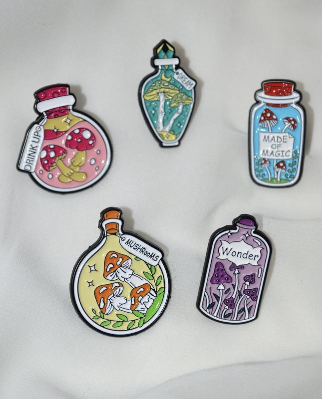 Набір значків / пінів металевих милі та яскраві грибочки в баночках (5 шт)