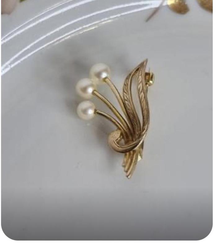Вінтажна Брошка Mikimoto із золота , інкрустована 3 вінтажними японськими перлинами Akoya. Ідеальний стан Це чудова золота брошка Mikimoto 9 карат, імпортована для ринку Великої Британії з лондонською пробою 375 та датована 1970-1971 роками з картушем Mikimoto для MP 'Mikimoto Pearl's. У ідеальному вінтажному стані з трьома перлинами розміром від 4,7 мм до 5,5 мм. Перлини Akoya, вирощені в солоній воді, знаходяться у відмінному стані, з глянцевим блиском та високою яскравістю. Без коробки Розмір брошки: Д31,4 мм x Ш18 мм, найдовші та найширші точки. Вага: 3 грами. перли Akoya несуть багату символіку, яка охоплює чистоту, жіночність, кохання, багатство, духовність та спокій. Їх цінують не лише за їхню вишукану красу, але й за глибші значення, які вони несуть. клеймо: M (Mikimoto Mark).