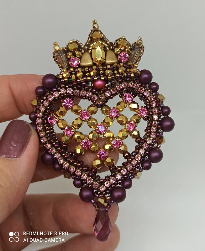 Брошь ручной работы сделана из качественных материалов: кристаллов и жемчужин Сваровски, чешских бусин и японского бисера. Высота 8 см, ширина 6см.