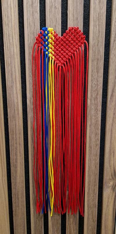 Брошка серце, Виготовлена в техніці макраме. Ширина 10 сантиметрів, висота 7 сантиметрів, довжина китиць 33 сантиметра.