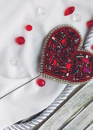 Невелика і яскрава брошка-шпилька "Червоне серце". У роботі використана тяганина, чеський і японський бісер, скляні камені і стрази. Виворіт з італійської шкіри червоного кольору. Розмір - 10 х 5,5 див.