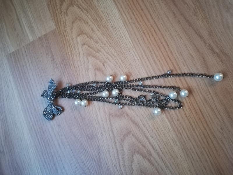 Брошь под чернонное серебро, с цепочками. Две нити можно пристегнуть. Длина нитей 20, 23, 35, 36 см, размер банта 6 х 3 см. Все элементы на месте, идеальное состояние, нюансов, потертостей, сколов нет.