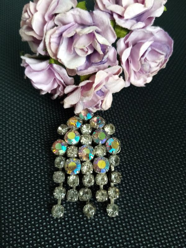 Красива, ошатна вінтажна брошка з підвісками. Більш великі кристали мають покриття АБ. Стан дуже пристойне, в силу віку є потертості покриття АБ, але при цьому вона все одно яскраво і ефектно переливається і виглядає дорого, застібка робоча.