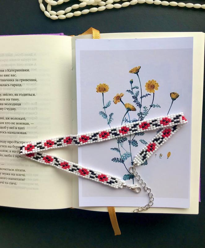 Ширина 1 см, довжина разом із застібкою 34 см (+5 см подовжуючий ланцюжок). На замовлення можна виготовити прикрасу іншого кольору та будь-якої довжини.