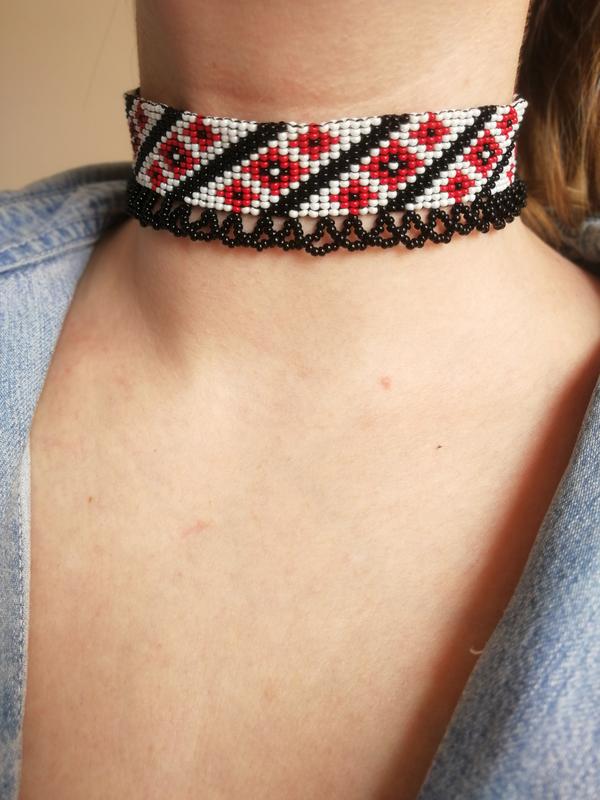 Чокер з геометричним принтом на зав'язках. Відсутність замочку значно полегшуе його вдягання. Китиці триколірні, як і сама прикраса. По нижньому краю гердан оздоблений підвісками чорного кольору, які імітують мереживо. Відеоогляд цієї роботи можна подивитись в інсті uliublena_donya
