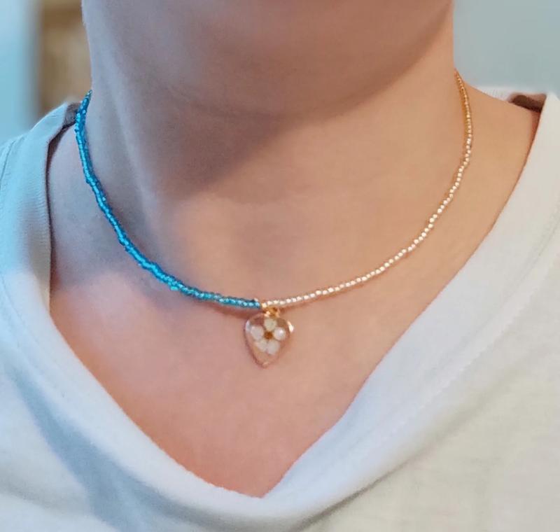 Чокер виконаний з чеського бісеру, нержавіючої сталі,та епоксидної смоли. всередині серденька справжня квітка.