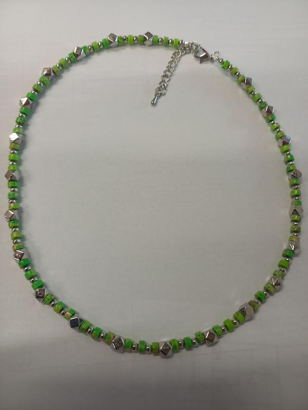 Чокєр яскравого літнього кольору. Довжина 50 см + 5см подовжувач-ланцюжок. Пресована бірюза, металеві та пластикові намистини