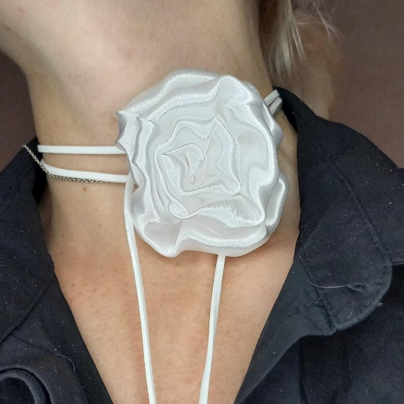 Квітка ручної роботи з довгим шнурком доповнить ваш образ. Діаметр 6-8см. Розмір троянди, колір та кількість може бути під замовлення.