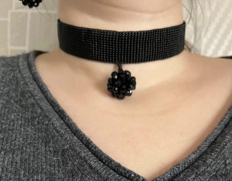 Чокер з підвісом у вигляді кульки, виготовлено з чешського бісеру, металевих застібок, куля - підвіс виготовлено з кришталевих намистин, в наявності типові сережки, вигляд і розмір максимально показано на фото. Відповім на всі питання, відправлю зручною вам поштою після оплати на картку Приват чи Моно, читайте в розділі « про мене», з безпечною оплатою і накладним платежем не працюю,