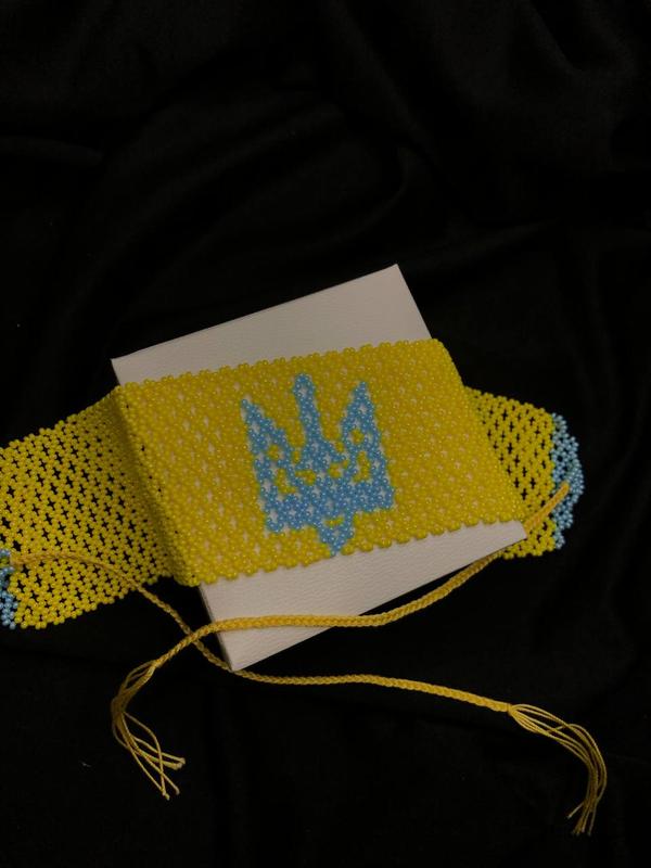 Чокер виконаний із чеського бісеру в патріотичних кольорах. Ширина - 5,8 см Довжина - 28,5 см + зав'язки