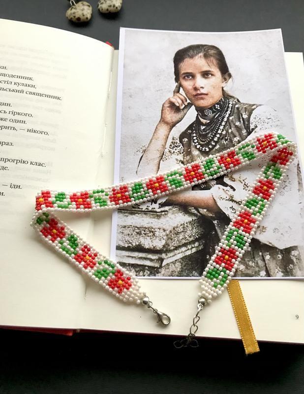 Тоненький делікатний бісерний чокер з традиційним візерунком. Кріплення можливе у двох варіантах: біжутерна фурнітура як на фото або пришита стрічка, що зав’язується позаду шиї бантом. Ширина 1 см. Довжина разом із застібкою 34 см (+подовжуючий ланцюжок 5 см). На замовлення виготовлю будь-якої довжини, кольори також можна обрати інші ❤️ Додаткові характеристики: Матеріал: Бісер