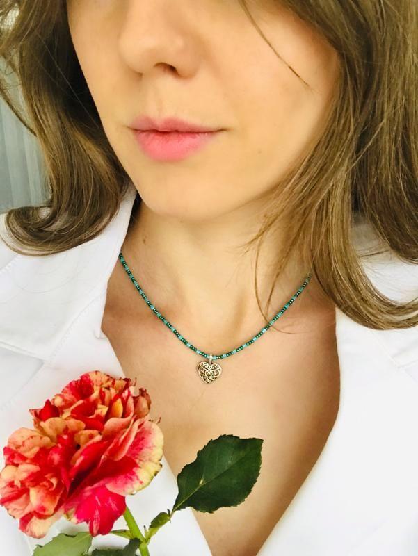 Ізумрудно-бірюзовий чокер з бісеру з ажурним сердечком