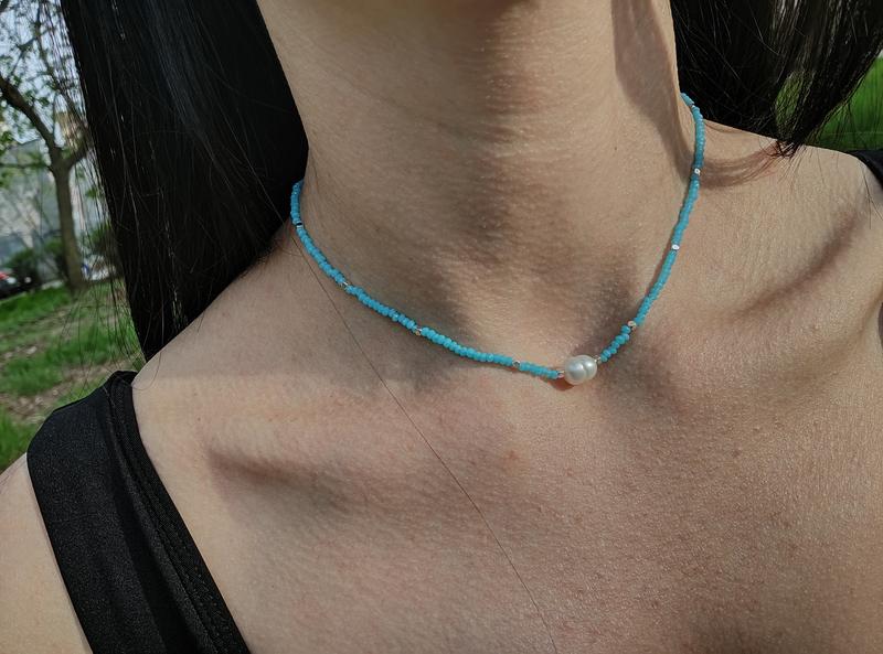 Чокери з блакитного кришталю,гематіту та намистина річкової перлинки. Кришталь блищить та перехід кошачого ока.