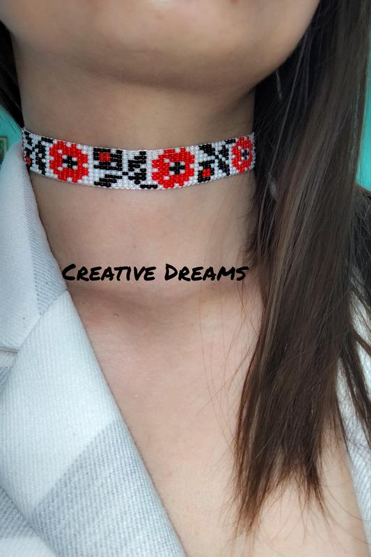 чокер ручної роботи виконаний з якісного чеського бісеру. довжина 29 см, ширина 1.5см, довжина зв'язок 18 см. За деталями звертайтесь в повідомленні з радістю відповім
