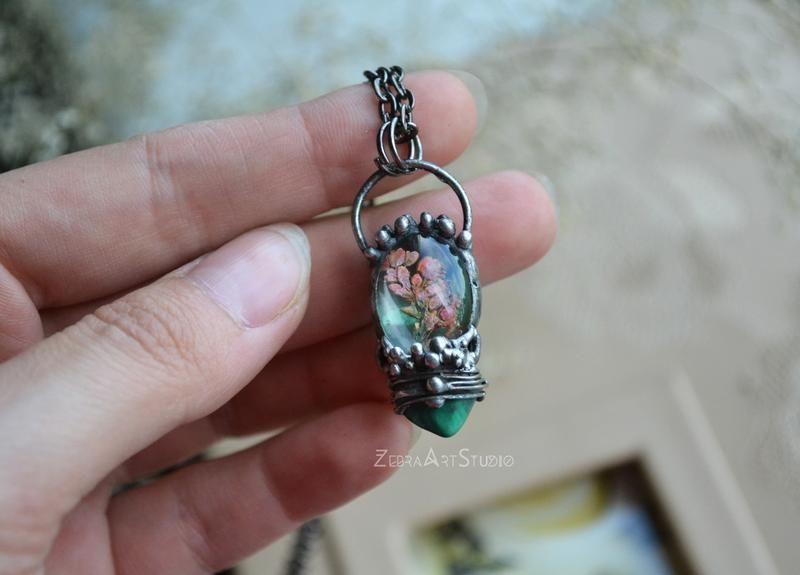Кулон з малахітом, чокер з сухоцвітом, кулон з гербарієм, подарунок на день народження
