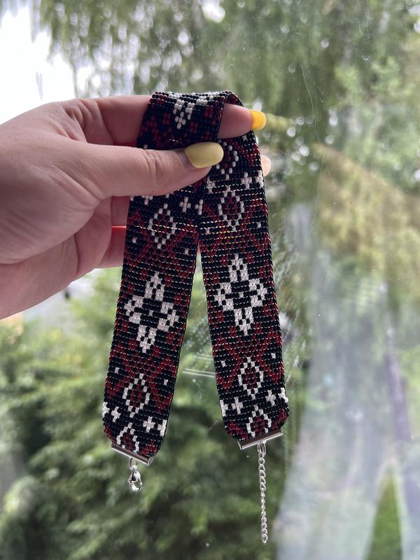 Сьогодні все більш актуальними стають прикраси ручної роботи з автентичними орнаментами. Пропоную Вам оригінальні прикраси з бісеру. Вони можуть стати чудовим подарунком близькій людині на будь-яке свято. Чокер виготовлений з якісного чеського бісеру і міцних поліестерових ниток. Фурнітура з нержавіючої сталі (медичний сплав). Підходять фактично на будь-який обхват, застібка має подовжуючий ланцюжок. Можна придбати в комплекті з браслетом. Ширина: 3,5 см. Довжина: 34 см (+ подовжуючий ланцюжок 4 см) *колір орнаменту можна обрати на свій смак *виготовлення 1-2 дні.