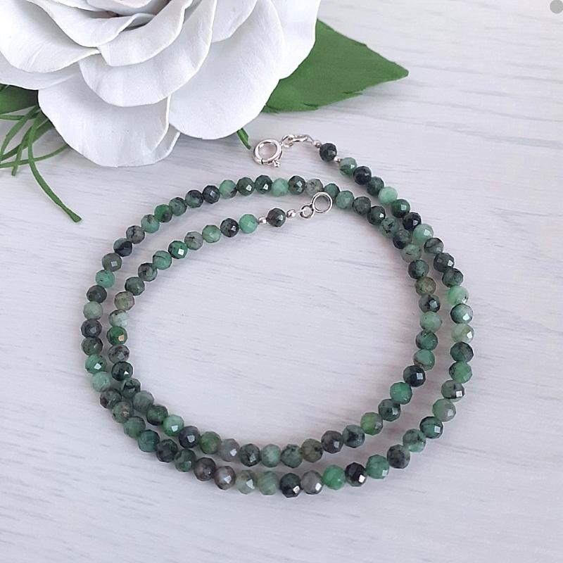 Чокер ручної роботи з натуральним смарагдом (кожна намистинка з мікроогрануванням). Колір каменів - різні відтінки спокійного зеленого кольору, іноді з вкрапленнями чорного. Якість АА. Наживо камінчики дуже гарні, фото не передає їх красу. Розмір намистин 4 мм Довжина чокера 42 см, лягає приблизно як ланцюжок 40-41 см. Фурнітура на чокері - срібло. Чокер зібран на ювелірний тросик виробництва Японії. В комплект можна придбати довгі сережки зі смарагдом (в наявності у магазині)