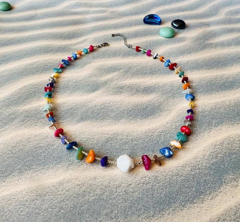 Яскравий чокер з кольорових сколів агату, сріблястого японського мікро-бісеру та керамічної намистини у формі мушлі. Ця прикраса стане ідеальним доповненням вашого літнього образу. Довжина: 42 см Фурнітура з нержавіючої сталі. Подарункова упаковка.
