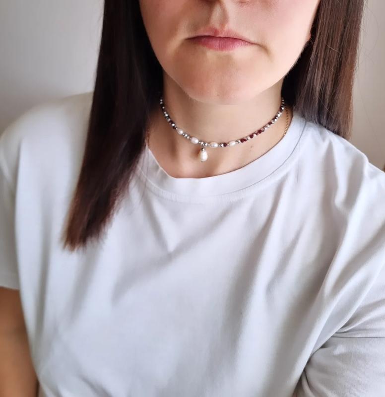 Чокер в якому ідеально поєднується кришталь та натуральні річкові перлини. Виготовлений з якісних матеріалів. Всі металеві елементи з нержавіючої сталі. Довжина з застібкою - 35 см + 7 см ланцюжок подовжувач.