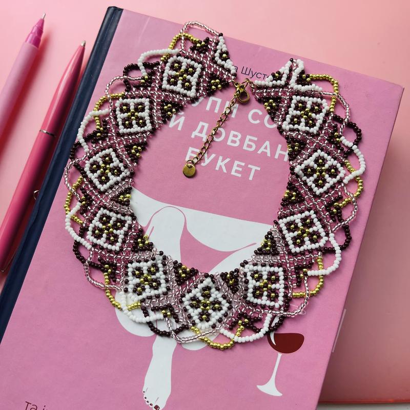 Традиційна українська прикраса з старовинним орнаментом, але з рожевим кольором. Прям дуже нравиться :) є ще з більш насиченим кольором