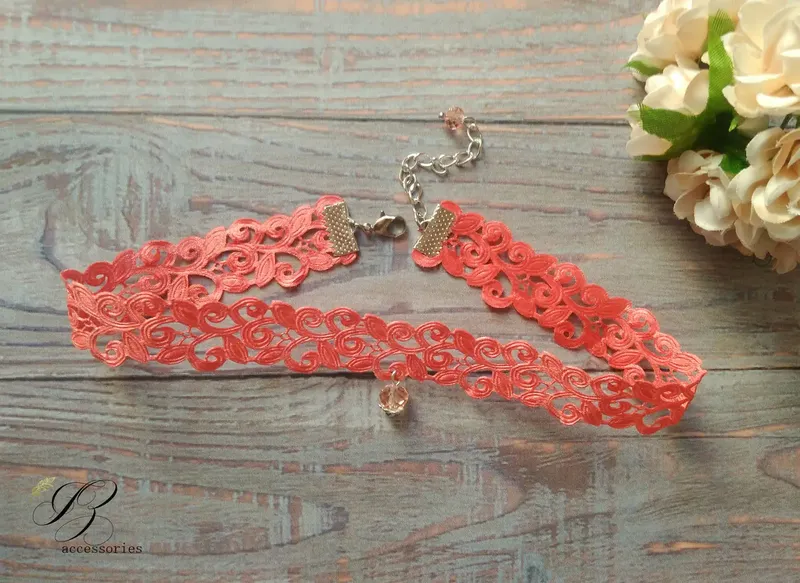 Кожна деталь гармонійно поєднується і надає прикрасі вишуканості та неповторності. Зроблений із любов'ю, зроблений для вас. Виріб з мережива – справжня знахідка для мрійливих та ніжних дівчат, яка надасть Вам повітряного та легкого вигляду. Такий чокер чудово виглядає з сукнею, блузкою в такій же кольоровій гаммі. Матеріал: мереживо, біжутерний сплав, кришталь. Колір: кораловий. Колір фурнітури: сріблястий. Розміри: - ширина 2 см.; - довжина в не розтягнутому вигляді 31 см. + 5 см. подовжувач.