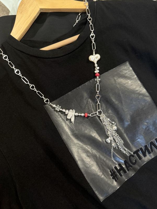 Стильне кольє зі сталі з гірським кришталем, гематитом, коралом та акрилом Довжина ланцюжка 80см Підвіска 11см