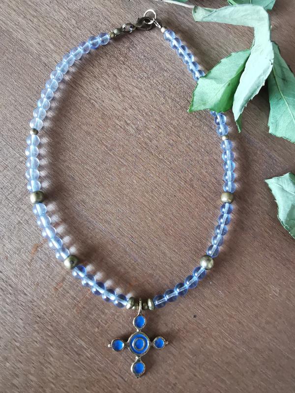 Чокер в этностиле к традиционному стру и пловскивому акценту в образе. Очень нежный но заметный чокер из стеклянных намтстин на металлической струне, латунная фурнитура, авторский крест с эмалью василькового оттенка. Ручная сборка.