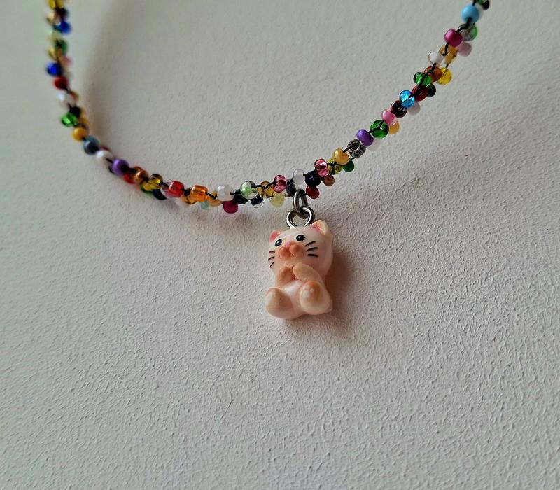 Чокер ручной работы плетёный бисер подвеска котик фосфор разноцвет миниатюр хендмейд уника...