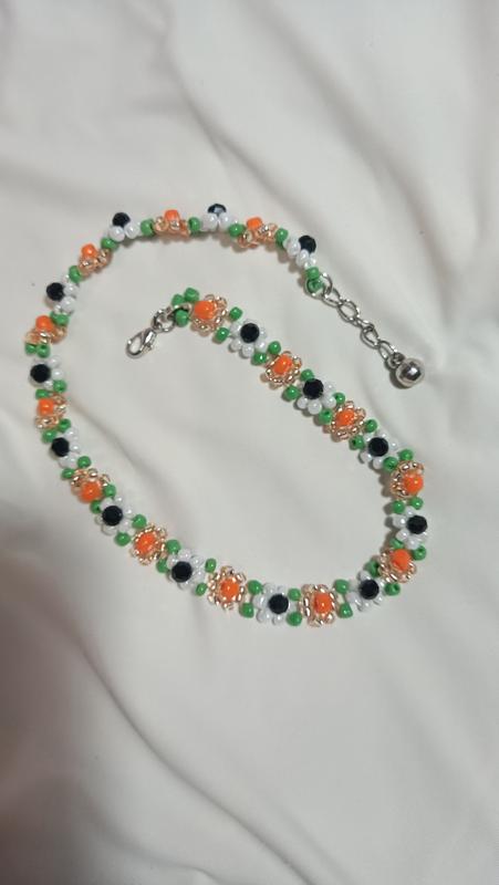 Чокер ручної роботи з бісеру Ніжне кольє, сплетене вручну з якісного бісеру. Поєднання зеленого, білого, чорного та яскравого помаранчевого кольорів створює свіжий, стильний акцент. Квіткові елементи додають прикрасі легкості та оригінальності.