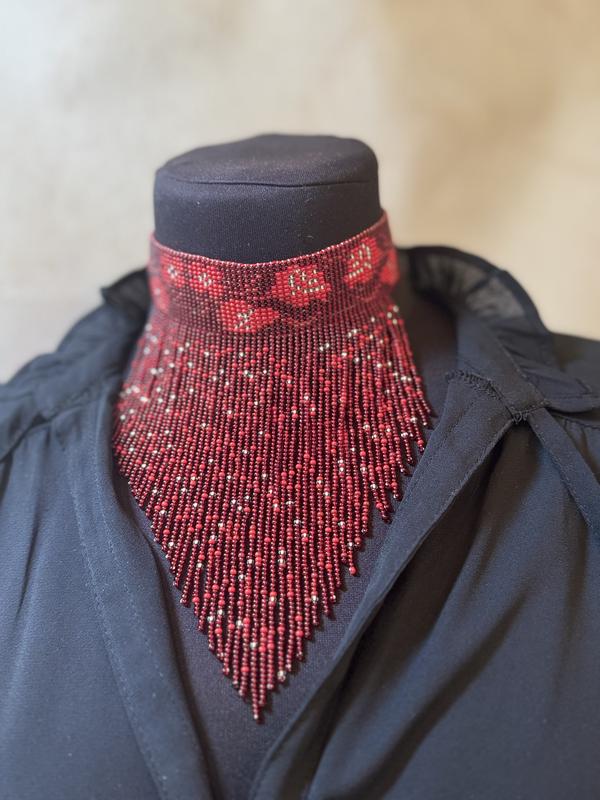 Червоне - це памʼять Це сила,що передається з рук в руки Це тиша, в якій звучить серце. Для жінки, яка знає,ким вона є Стрічковий гердан, довжина 34 см Регулюється за допомогою завʼязок косичок