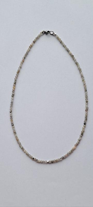 375 грн мінімалістичний чокер із лабрадора, грановані намистини 2,8 мм, основа міцна нейлонова волосінь, центральна металева намистина та кріплення з родієвим покриттям, застібка карабін із неіржавкої сталі 39 см можливі варіанти