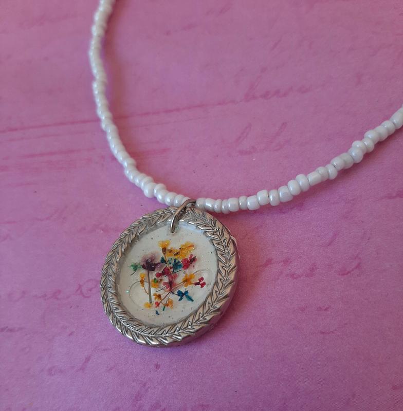 чокер з кулоном ручної роботи з мініатюрними квітами (сухоцвіти)