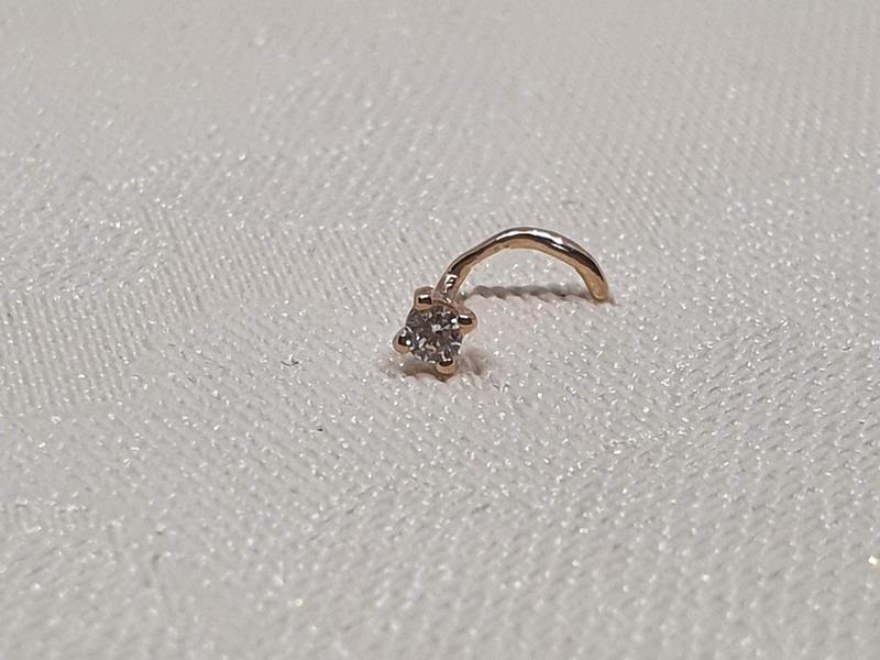 Серьга-пирсинг в нос из красного золота 585 пробы с фианитом Серьга-пирсинг в нос из красного золота 585 пробы выполнена в классическом дизайне. Она имеет небольшие размеры, поэтому очень удобна и никогда не будет выделяться из общего ансамбля аксессуаров. Золотая серьга-пирсинг подойдет для молодых девушек, которые хотят подчеркнуть свой особый стиль и при этом всегда оставаться нежными и элегантными. Средний вес изделия - 0,14 г Вес конкретного изделия уточняется при подтверждении заказа