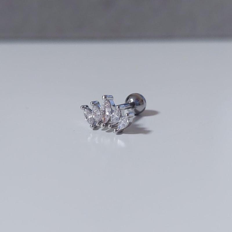 Сережка штанга для пірсингу вуха в срібному кольорі. В формі гілочки з 5-ма пелюстками. Прикрашена камінцями (циркон). Довжина штанги: 7 мм Довжина сережки: 9 мм Гіпоалергенна сталь.
