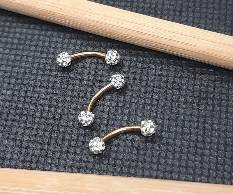 Сережки - мікробанани для пірсингу брови. Матеріал: медична сталь Розмір: 1.2×10×3×3 Колір: золото, з кульками, камінцями.